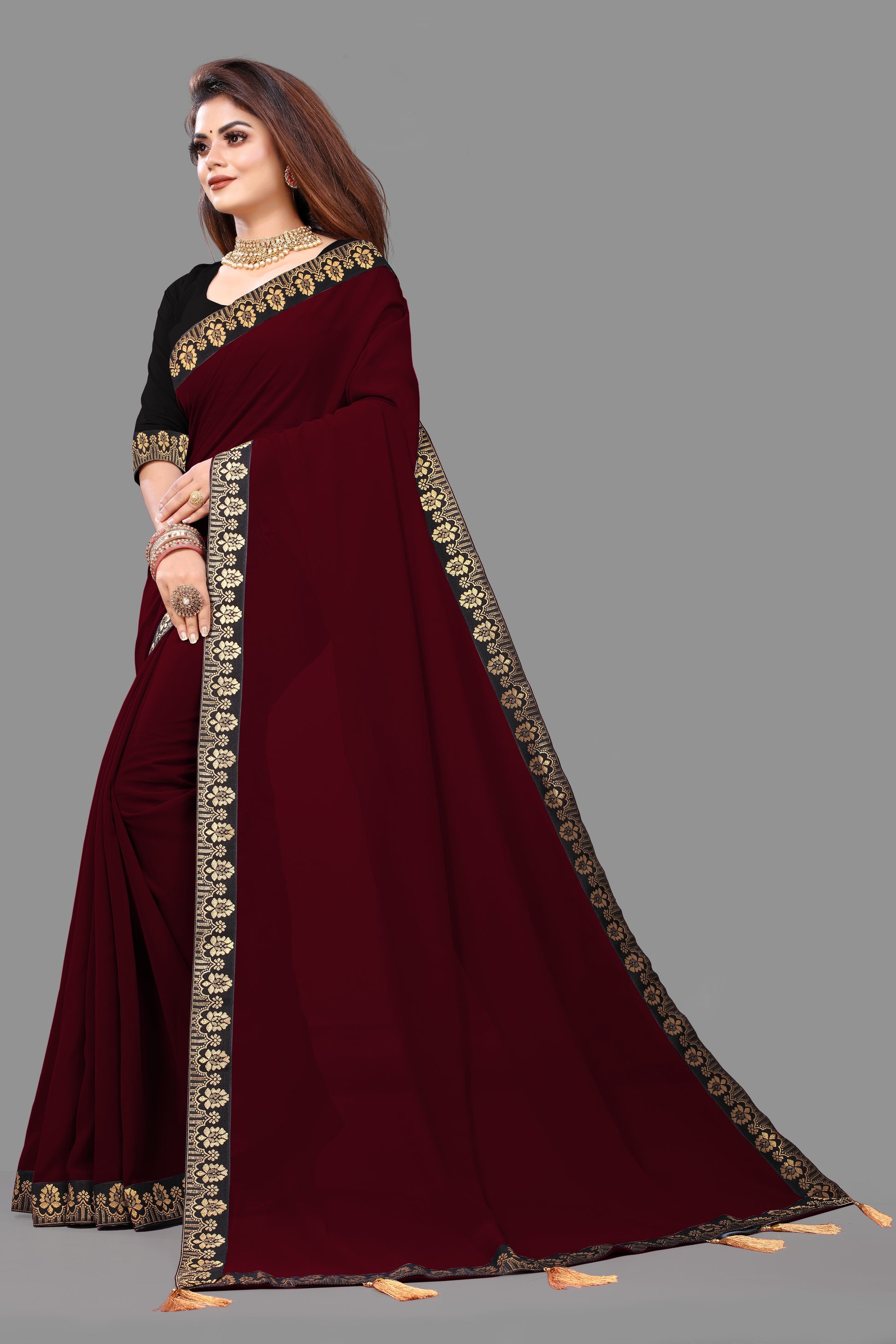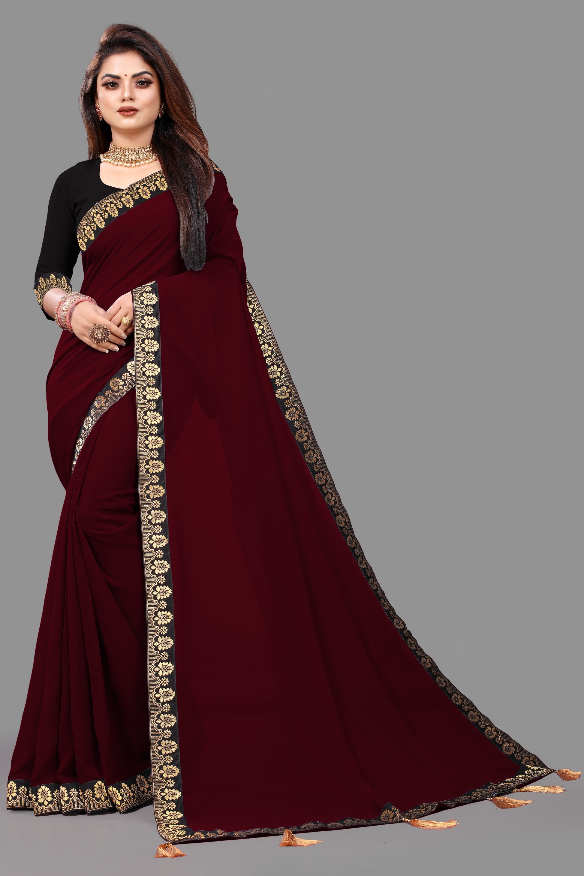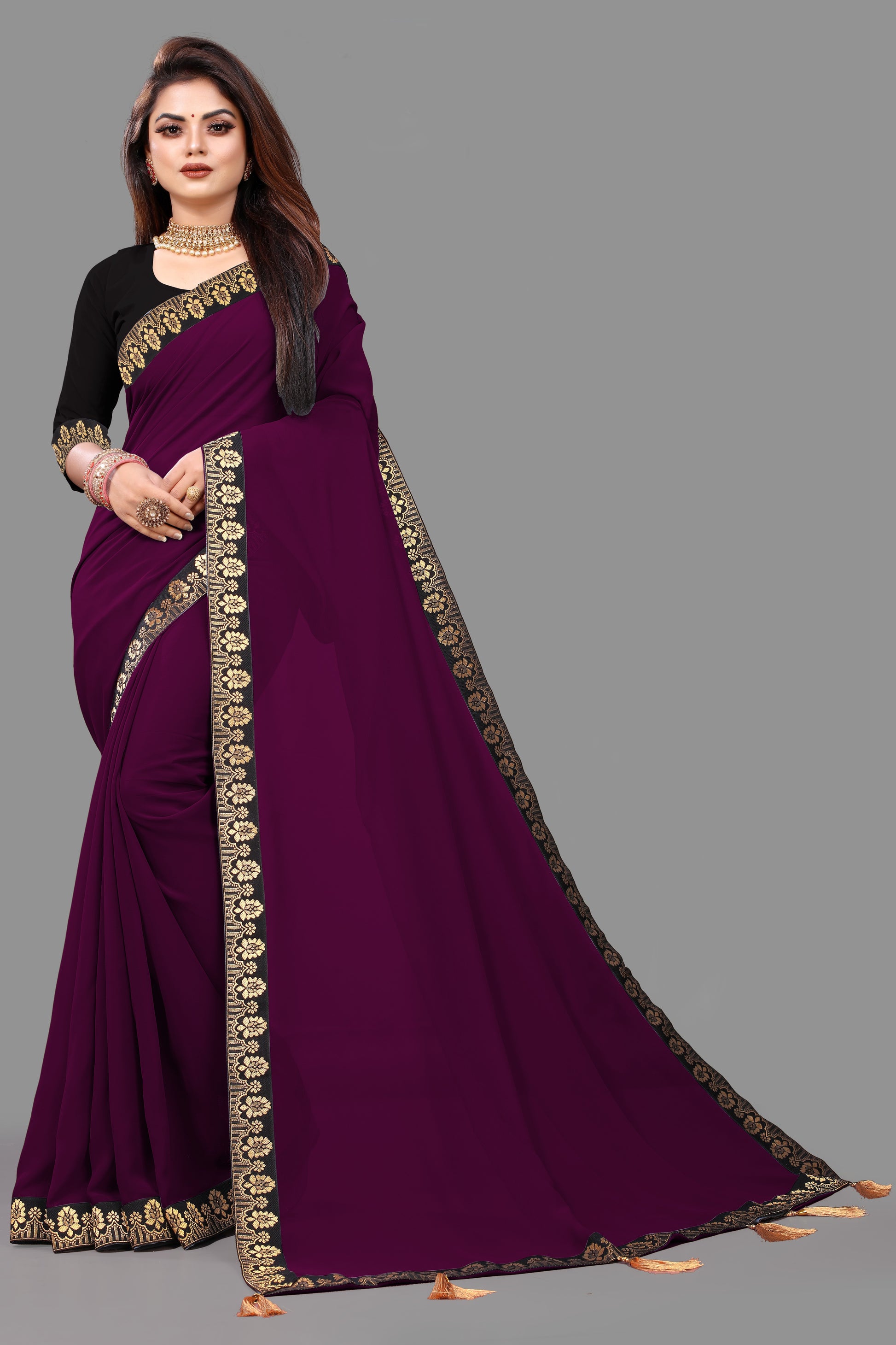 The saree features rich wine, red, and purple colour options, enhanced with a striking contrast border that adds definition and sophistication to the overall look. Its minimal yet graceful design makes it a versatile choice for festive gatherings, parties, family functions, and special occasions. It comes with a matching unstitched georgette blouse, allowing you to customise the blouse style to suit your personal preference.