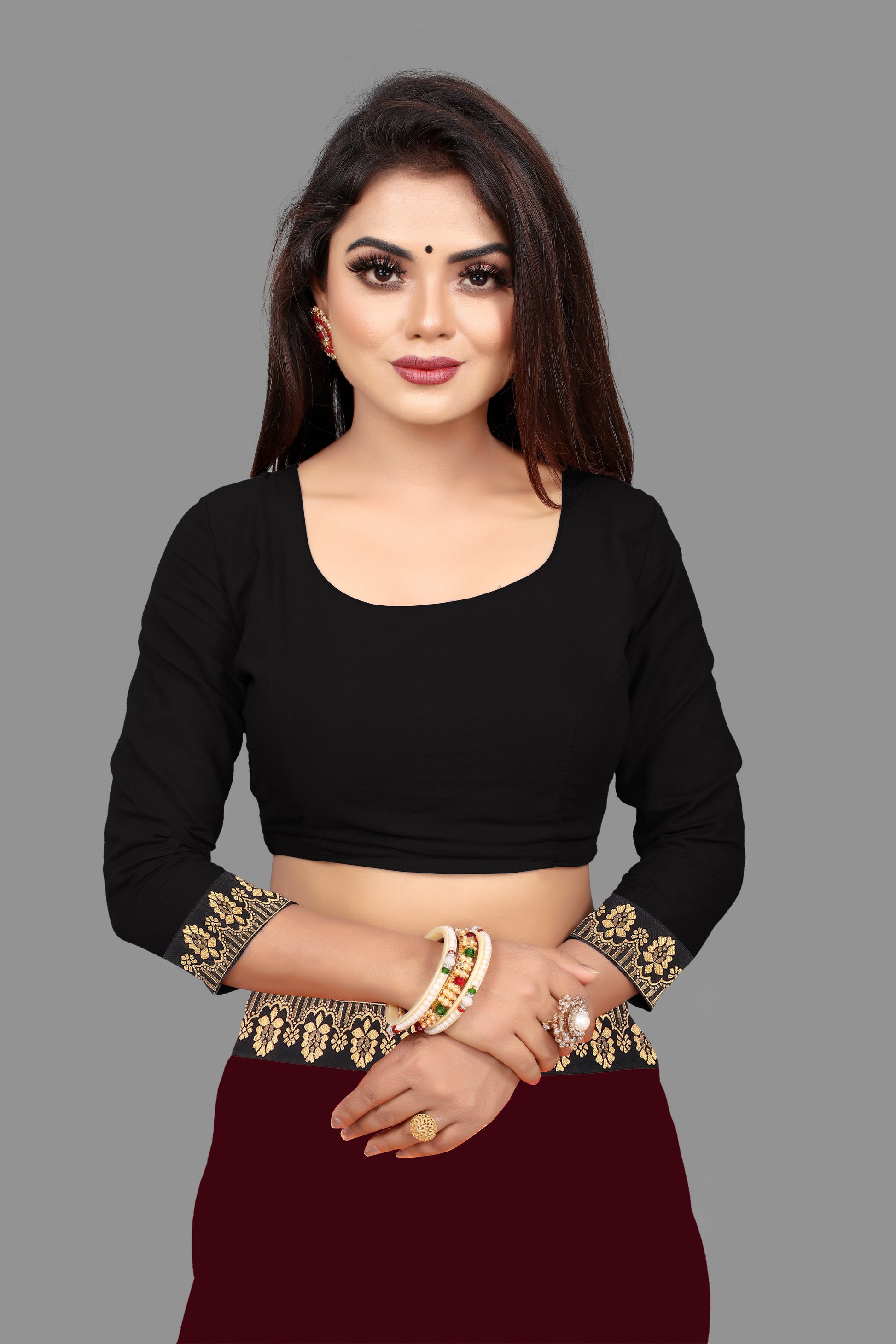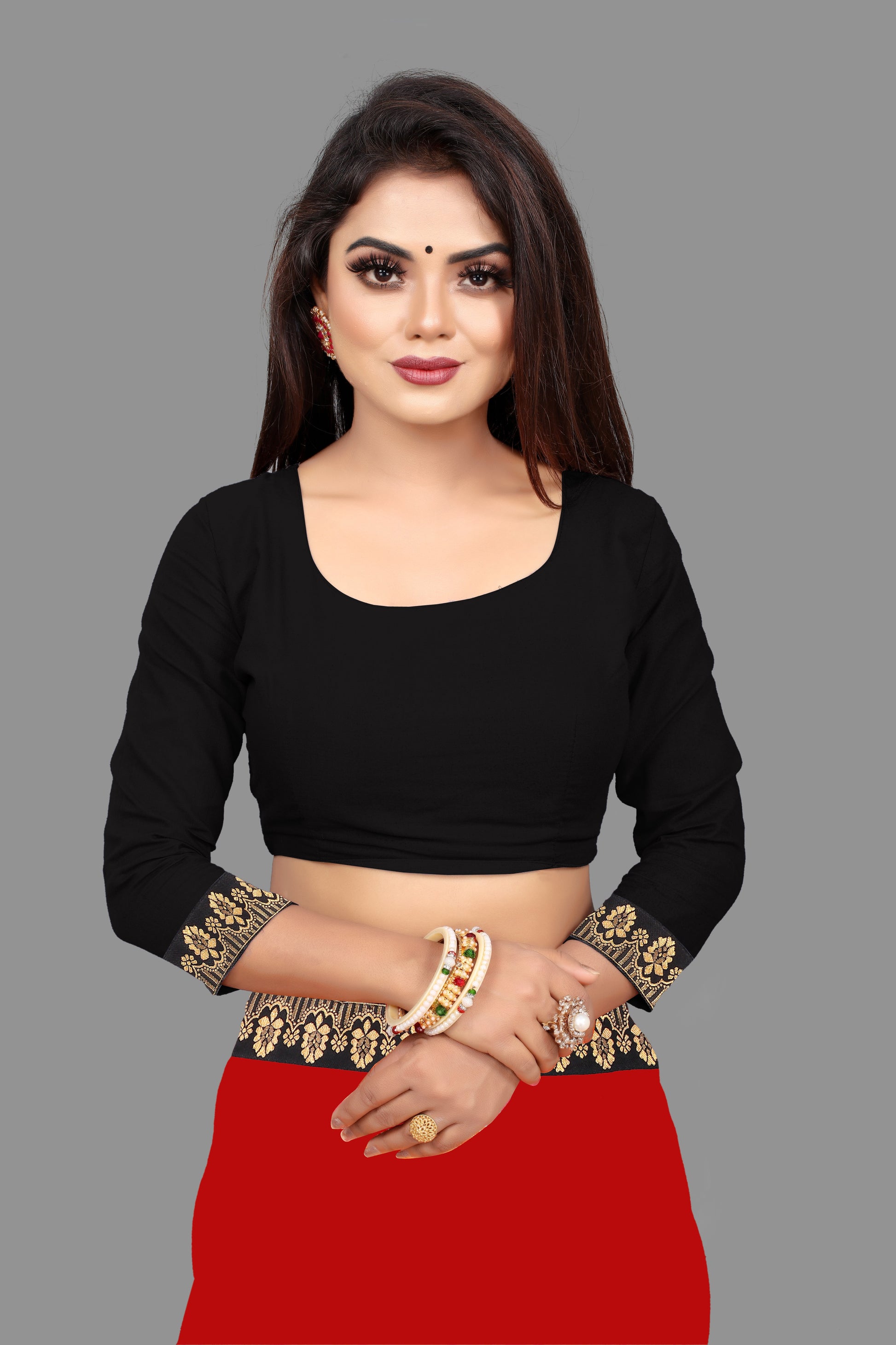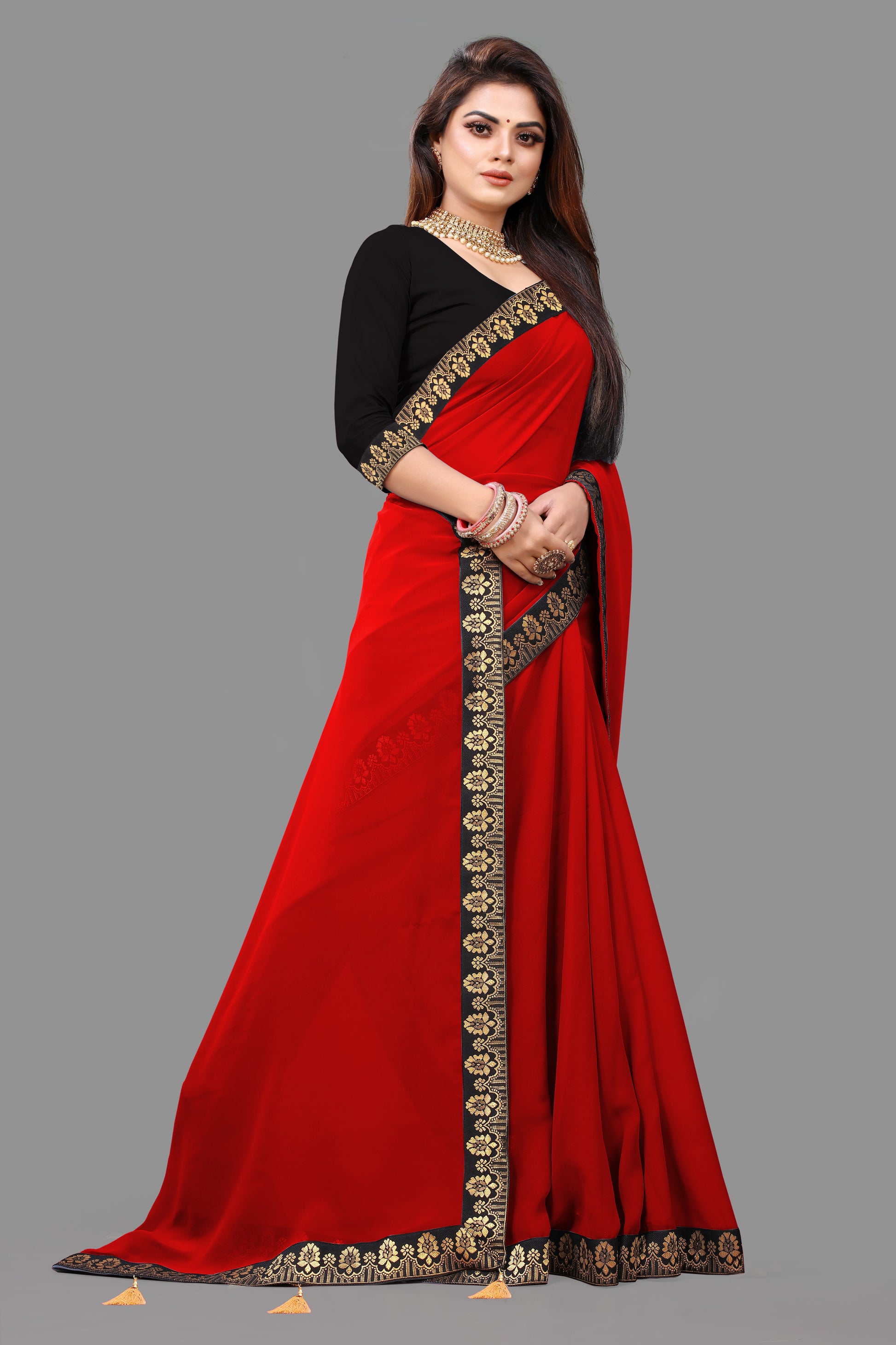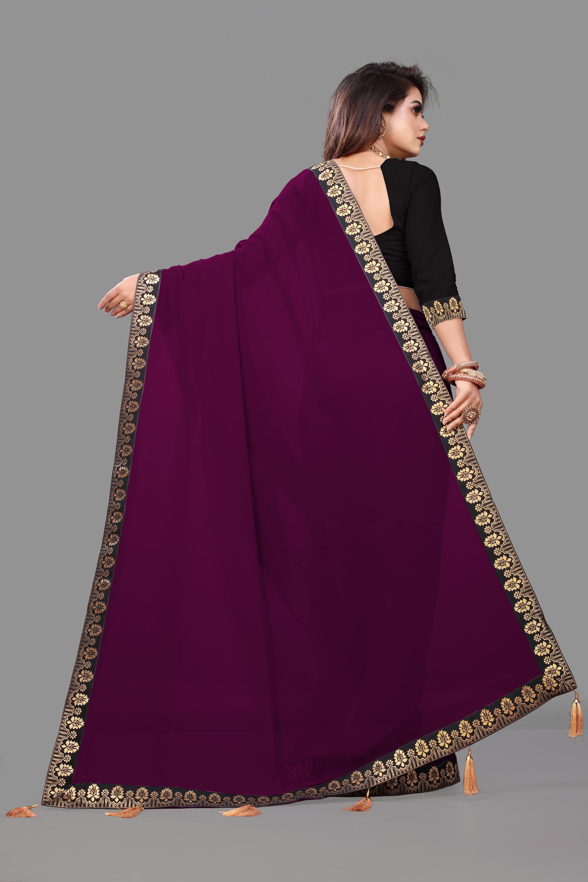 The saree features rich wine, red, and purple colour options, enhanced with a striking contrast border that adds definition and sophistication to the overall look. Its minimal yet graceful design makes it a versatile choice for festive gatherings, parties, family functions, and special occasions. It comes with a matching unstitched georgette blouse, allowing you to customise the blouse style to suit your personal preference.